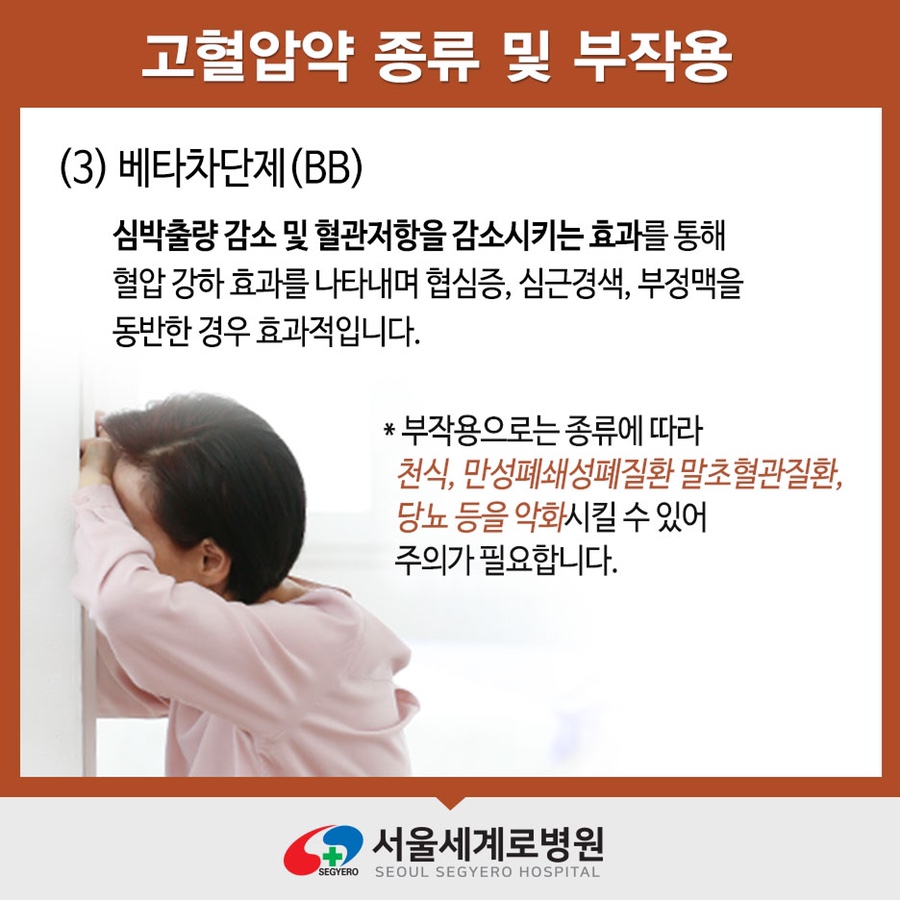 베타차단제는 심박수 감소 및 혈관저항을 감소시키는 효과로 혈압강하 효과를 나타내며 협심증, 심근경색, 부정맥을 동반하는 경우 효과적입니다.