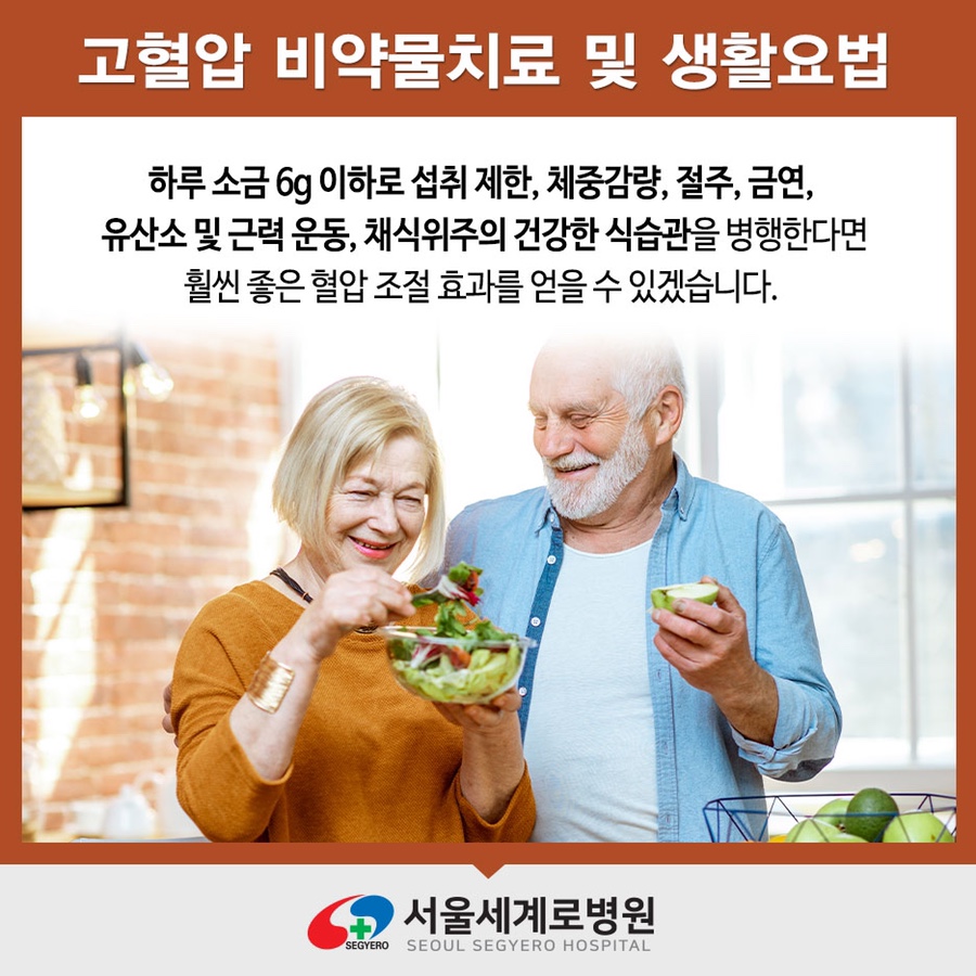 좋은 생활 습관은 고혈압 약 1병 정도의 혈압 강하 효과가 있습니다. 1일염 6g이하로 섭취제한, 체중감량, 절주, 금연, 유산소 및 근력운동, 채식주의자 중심의 건강식습관을 병행하면 훨씬 좋은 혈압조절효과를 얻을 수 있습니다.