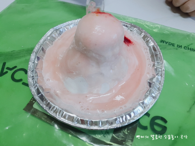 실험 결과 탄산수소나트륨에 식초를 넣었더니 거품이 일면서 흘러나왔어요.빨간색 색소를 아예 많이 넣지 못해 옅은 색이 된 게 아쉬웠지만 탄산수소나트륨과 식초의 반응은 잘 일어났습니다.