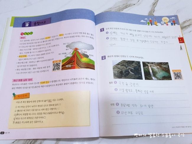 Step 2. 융합사고 * 화산 : 지구 내부에는 암석이 녹아 생성된 마그마가 있는데, ‘화산’은 마그마가 지각의 약한 틈을 타서 단시간에 한꺼번에 지표면 밖으로 나와 생긴 지형을 말합니다.