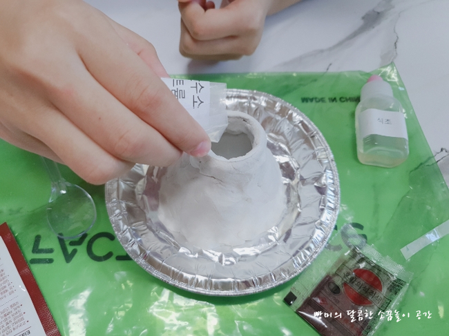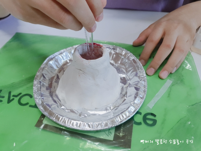 필름통에 점토를 잘 감싸서 산 모양으로 만든 다음 탄산수소나트륨+적색색소+세제+물을 넣고 잘 섞었습니다.