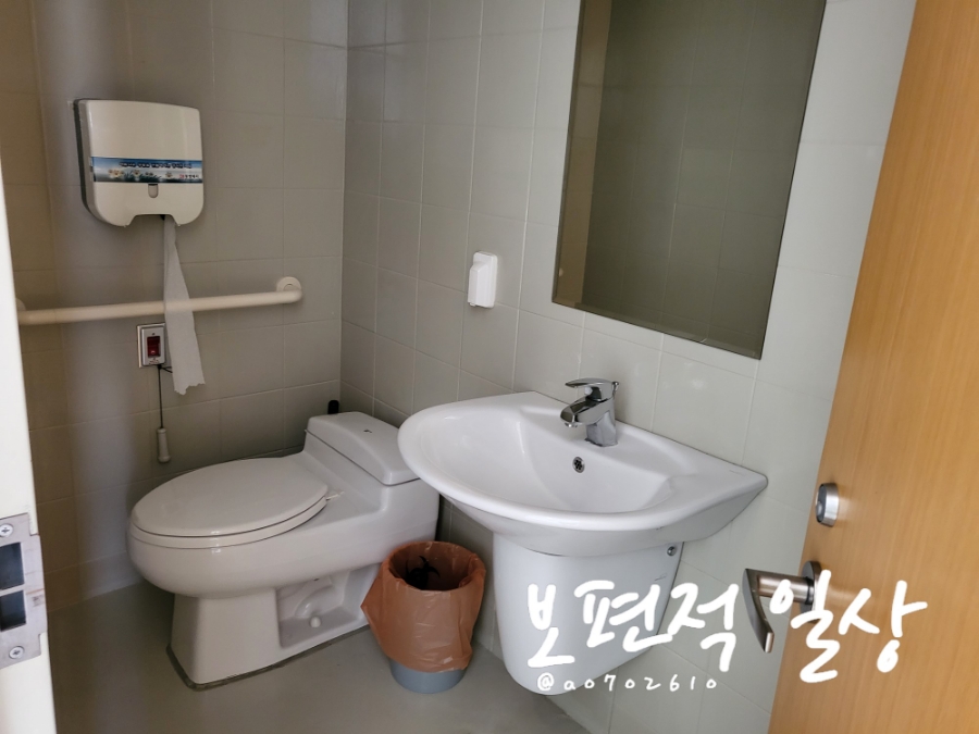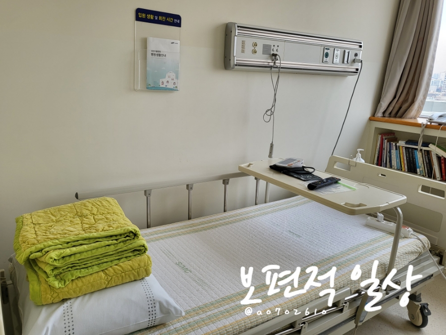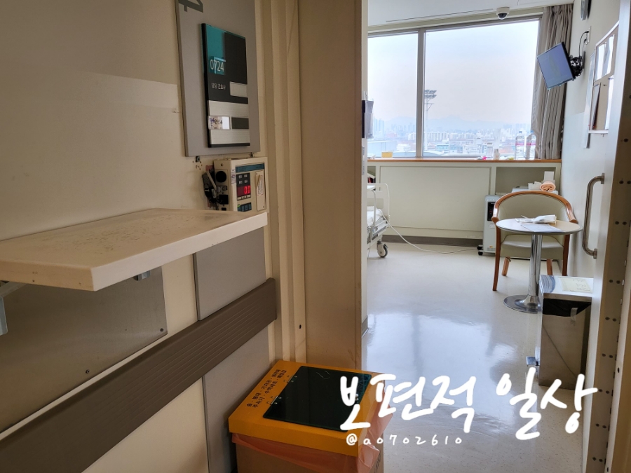 지금 사진 오른쪽에 보이는 두꺼운 문이 닫히면서 2박 3일의 격리생활이 시작된다.식사는 봉지 도시락으로 왼쪽 선반에.몰랐는데 병실에 있는 호출기에서 간호사가 밥을 가져오라고 안내해주었다.문이 열리면 소리가 나니까 빨리 갖고 들어가서 다 먹으면 봉지에 넣어 주황색 통에 빨리 버려야 해.밥 먹고 호출기로 불편한 점은 없는지 물어봐놓고 변비약 먹으라고 말해줘.