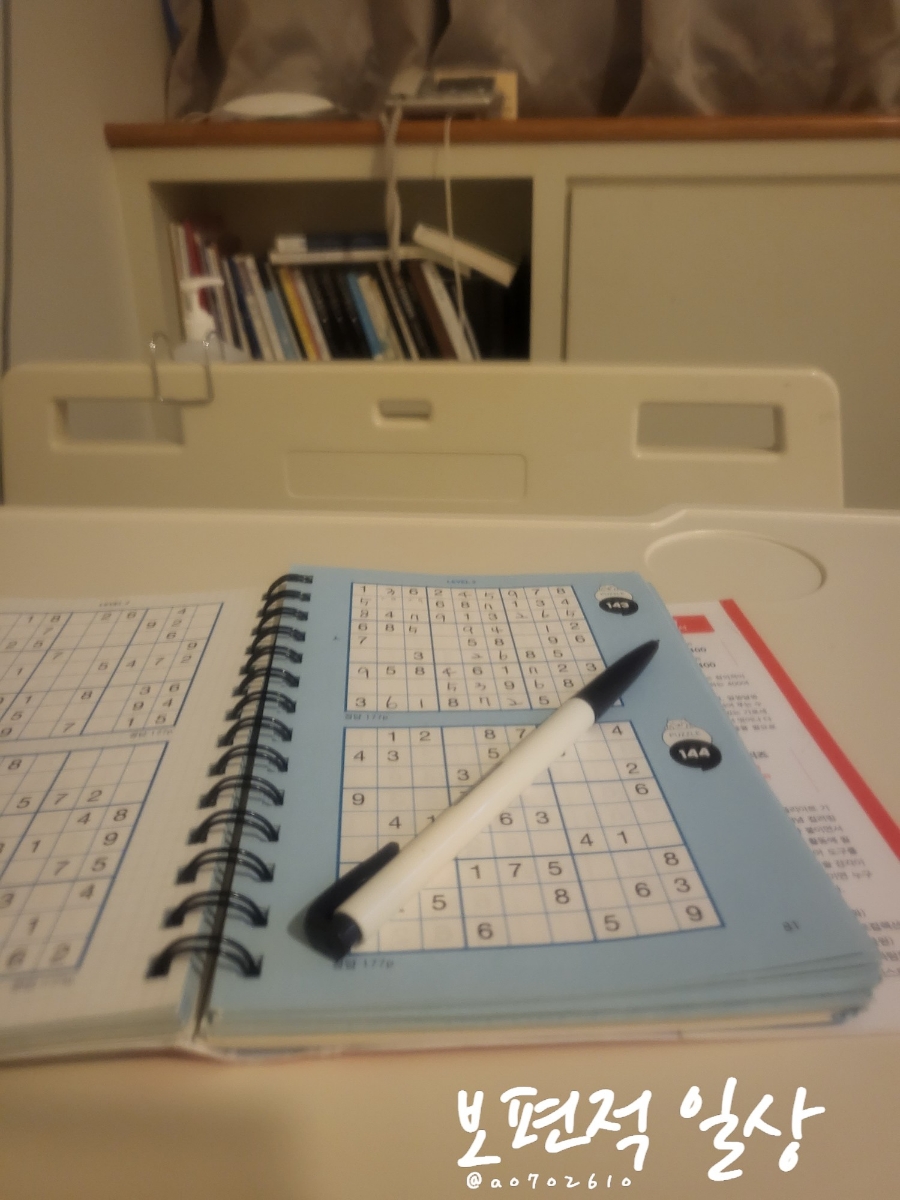 병실에서 뭐하나 싶어 책장을 보니 부동산, 암치료….. 헉! 스도쿠다 입원하신 분들이 간혹 하시던데 내가 무서워 보여서 2페이지 했는데 시간가는 줄 모르고 집중. 물 마시는 것도 잊을 수 있으니 조심해야 할 것 같아, 내일 19시까지 3리터는 마셔야 해. 하고 4리터 목표에 텀블러에 나눠서 수시로 마시면서 스도쿠중.