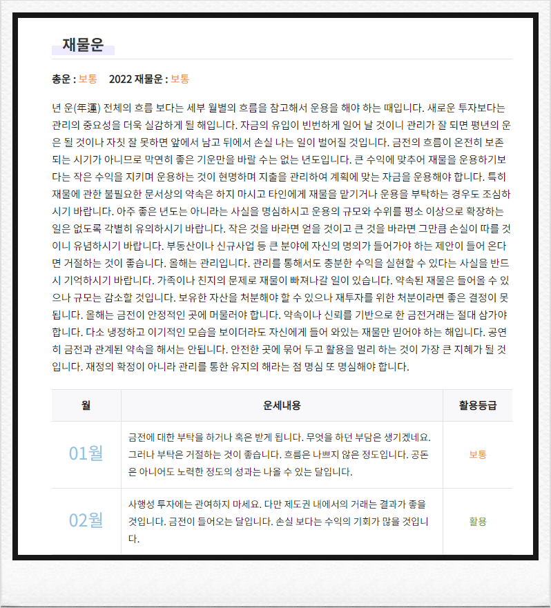 ▼사주를 모두 입력한 경우 아래와 같이 총론부터 재운 월별 운세까지 모두 확인하실 수 있습니다. 굉장히 디테일해요.
