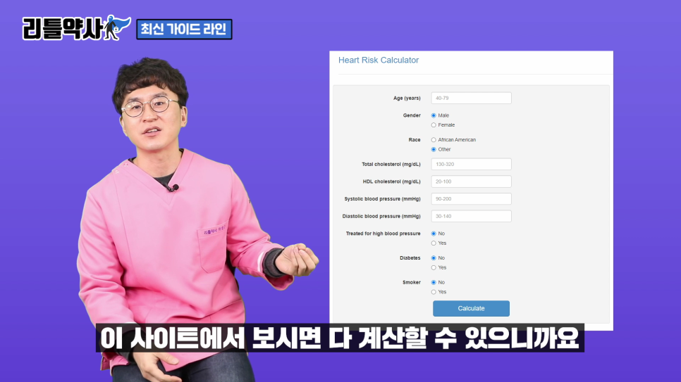 그 확률을 묻는 프로그램이 있습니다http://www.cvriskcalculator.com/CalculateyourriskforheartdiseaseandstrokeusingtheASCVDalgorithmpublishedinthe2013ACC/AHAguidelines.www.cvriskcalculator.com
