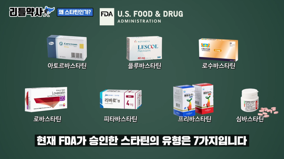 저희는 이러한 이유로 L DL을 낮추기 위하여 현재 FDA에서 7가지 스타틴 유형을 승인 받고 있습니다.