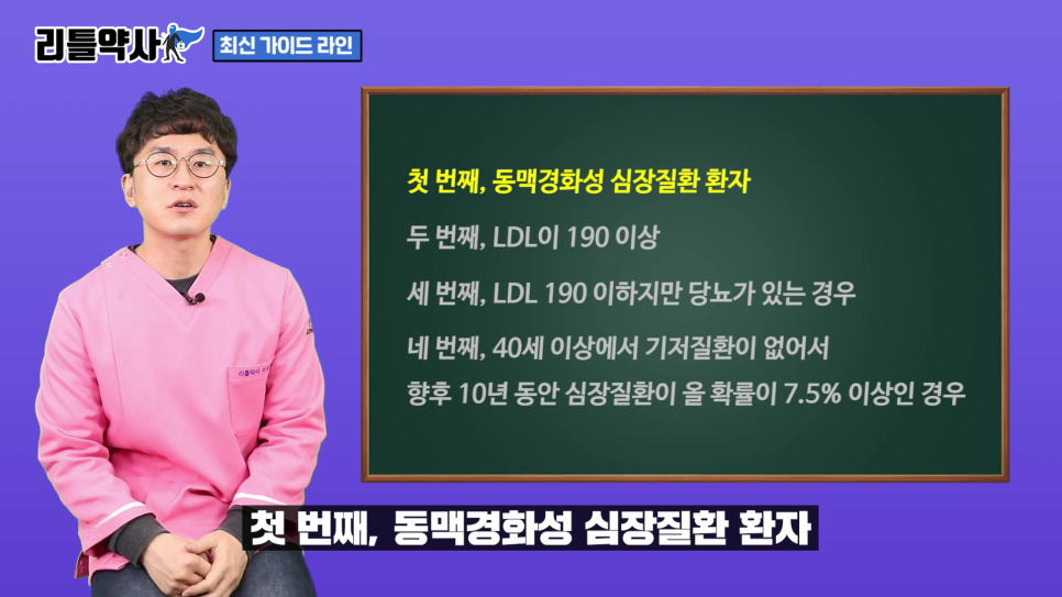 일단 동맥경화성 심장질환 환자.두 번째 LDL이 190 이상.셋째, LDL 190이하이지만 당뇨병이 있는 경우.넷째, 40세 이상 기저질환이 없으며 향후 10년간 심장질환이 올 확률이 7.5% 이상인 경우입니다.