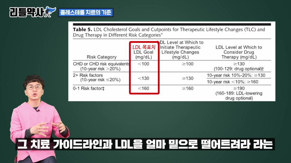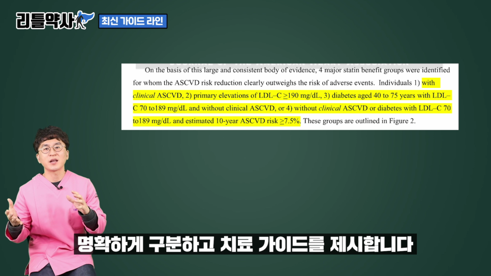 또한 LDL 수치를 어디까지 떨어뜨리라는 구체적 수치의 제안보다는 콜레스테롤 약을 사용하여 도움이 되는 그룹을 명확하게 구분하여 치료 가이드를 제시합니다.