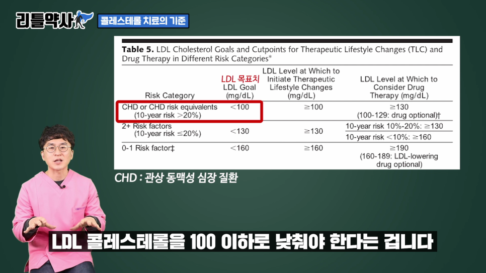 또 이 가운데 당뇨병이 있거나.10년 안에 관상동맥심장병(CHD) 유발 확률이 20% 이상인 사람은 LDL 콜레스테롤을 100 이하로 낮춰야 한다는 것입니다.