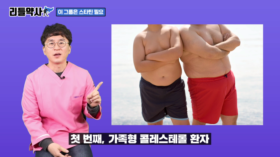 첫째, 가족형 콜레스테롤 환자인데 유전적으로 가족형 콜레스테롤 환자는 다양한 연구로 심혈관계 사망위험률이 매우 높습니다.