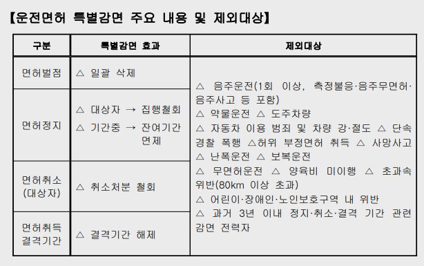 ④ 운전면허정지·취소절차 중단대상은 개별우편통지▶특별감면조회사이트 새정부 출범 및 제77회 광복절(8·15)을 기념하여 민생안정을 위하여 민생과 밀접한 운전면허 행정처분 특별감면을 ’22·8·15(월) 00:00에 시행합니다. ○ 특별감면대상 – ‘21.11.1(월)부터 ‘22.6.30(목) 사이에 발생한 교통법규 위반, 교통사고 등으로 인해 ‘22.8.15(월) 기준 운전면허 벌점 부과, 정지·취소 행정처분 진행, 면허시험 응시제한(결격) 기간 중인 사람 ○ 조치 및 효과 – 운전면허 벌점 부과자는 벌점 삭제, 운전면허 정지·취소 절차 진행자…www.efine.go.kr