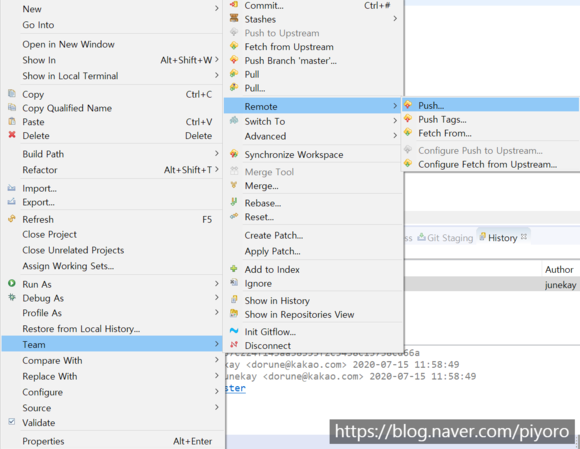 현재 sync를 맞출 필요는 없고, 방금 생성한 commit만 push 하면 되기 때문에 프로젝트 오른쪽 클릭 – Team – Remote – Push…로 시도해 볼게.
