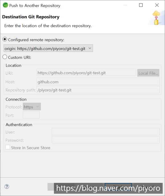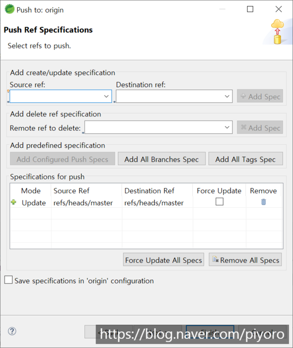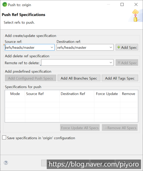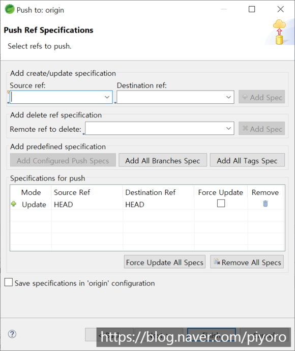 Push Ref Specifications ?? 이전에 git 원격접속을 할 때 해본 경험에 무작정 Source ref : HEAD Destination ref : HEAD (Sourceref 선택하면 자동으로 바뀐다….)로 설정하고 Addd