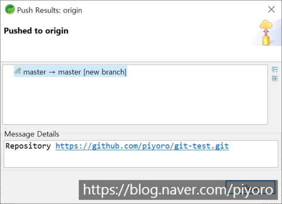 github.com/piyoro/git-test 레파지트리에 test.txt 파일이 push 되었음을 확인할 수 있다.