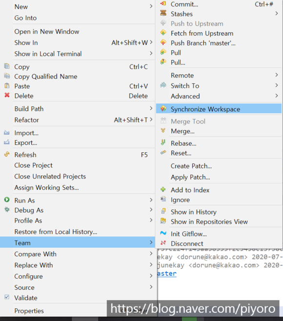 SVN 등… 다른 버전 관 리툴 쓰는 버릇으로 프로젝트 오른쪽 클릭 – Team – Synchronize Workspace 습관적으로 누르려다가… 망설여진다.이클립스에서 git을 이렇게 쓰는 게 맞는지는 생각으로 다른 방법도 생각해 보았다.