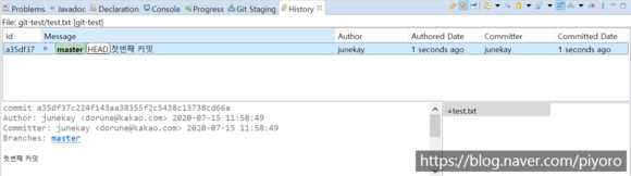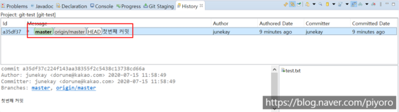 push 후 이클립스에서 History뷰를 보면 마지막 커밋이 로컬저장소: master 원격: origin/master임을 확인할 수 있다.