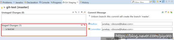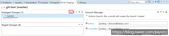 Eclipse Git Staging 뷰를 보면 Unstaged Changes 목록에 새로 추가한 test.txt 파일이 존재한다.커밋할 파일을 선택하고 + 아이콘의 버튼을 클릭한다.