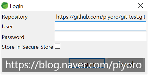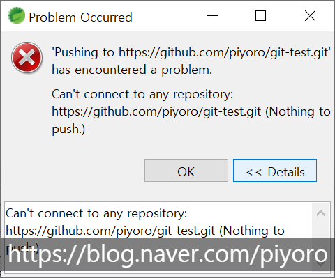 그대로 push 버튼을 클릭하면 “Can’t connect to any repository: https://github.com/piyoro/git-test.git (Nothing to push.)”로 오류가 발생한다.