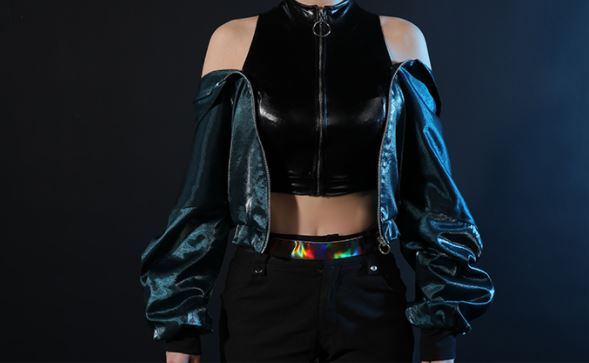 KDA 카이사 코스프레 상의는 가죽소재처럼 살짝 탄력있는 소재를 사용한 느낌이구요 앞면에 지퍼를 달아준 크롭상의라고 생각해요.
