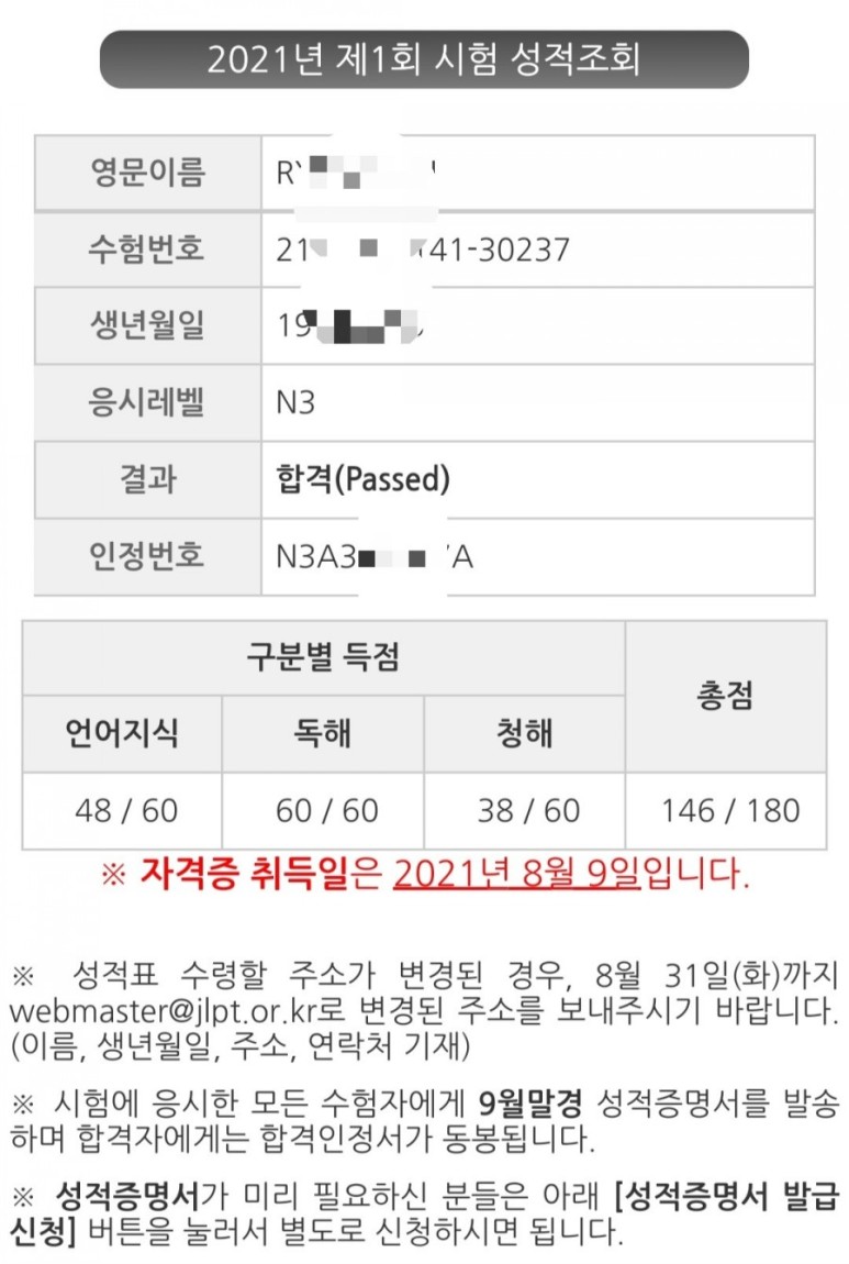 성적은 다음과 같습니다. – 언어지식 : 48/60 – 읽기 : 60/60 – 듣기 : 38/60 – 총점 : 146/180 (*합격컷 : 95/180, 각 과목 19점 이상)