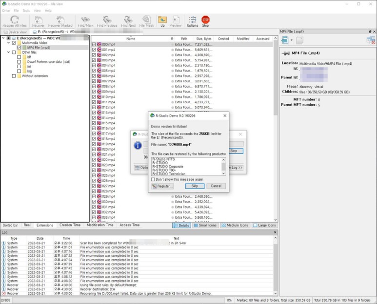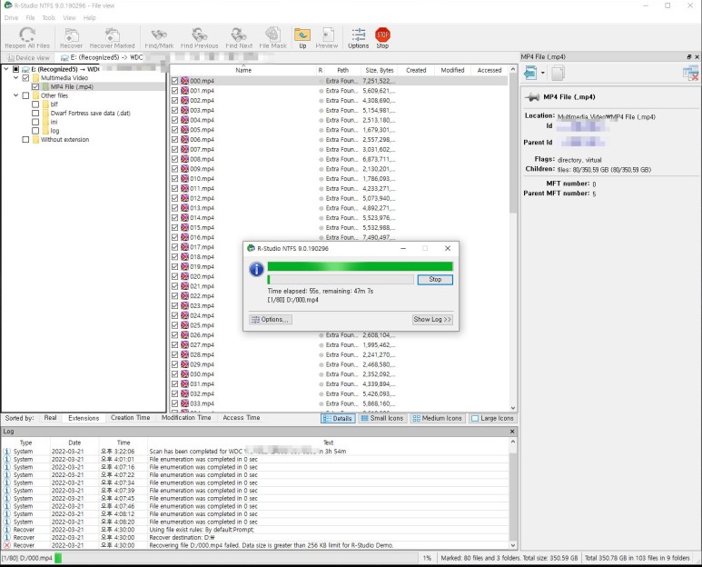 잘못 포맷해버린 4테라바이트 하드디스크 R-Studio 스캔 결과 80개의 파일이 검색됐다.h
