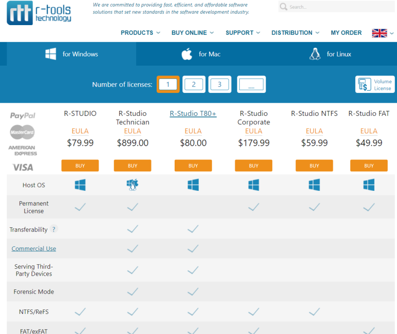 그런데 만일을 위해 두 개를 산다면 NTFS, FAT가 모두 포함된 라이선스가 가장 왼쪽에 있는 R-Studio($79.99) 라이선스를 구입하면 된다.