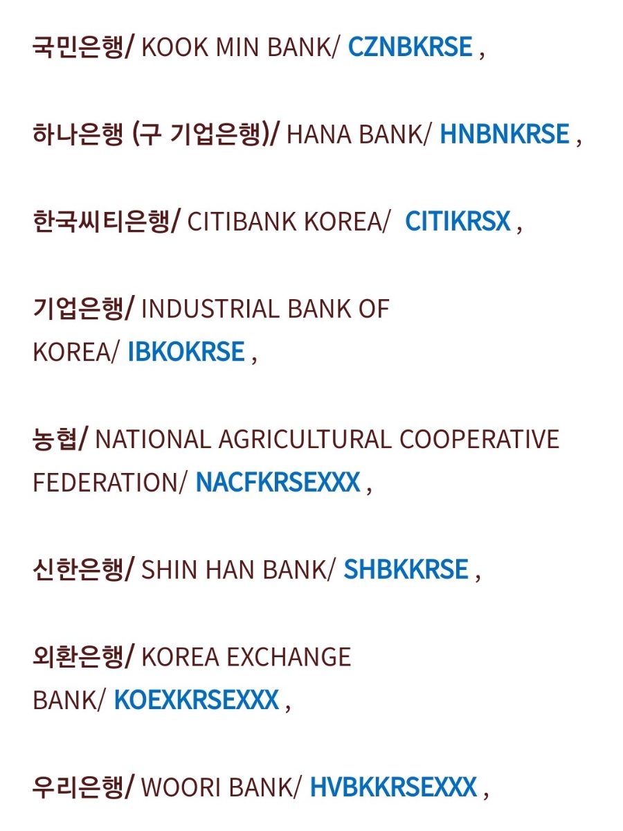 앞이 은행명 / 뒤가 swift 코드입니다.