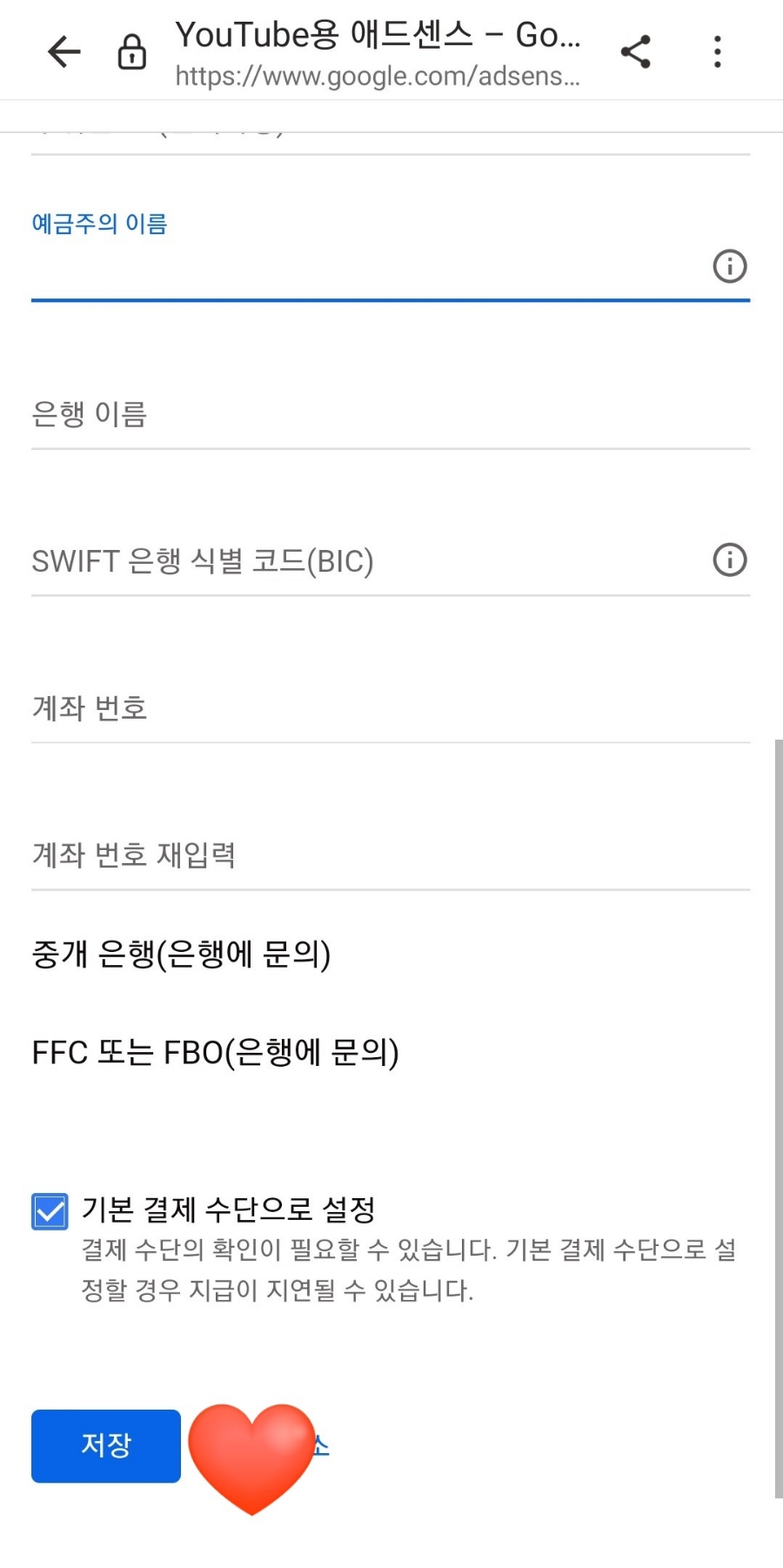 여기를 채우고 저장을 꾹 눌러주세요예금주는 영어로 은행명도 영어로 스위프트코드(아래에)도 영어로 넣고 계좌번호만 2번 넣어줘~~