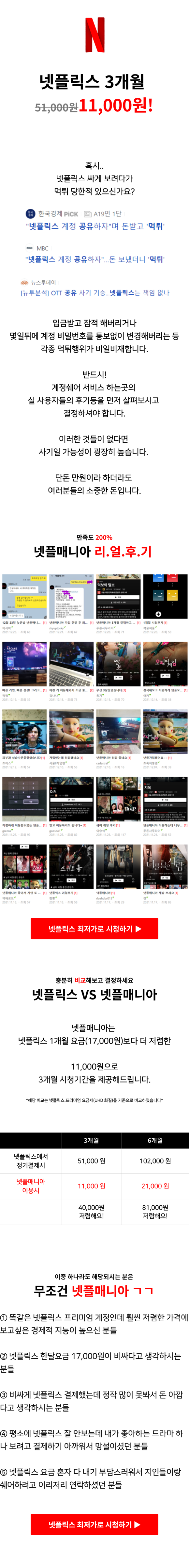 이런 이유로 합리적인 분들은 같이 시청할 지인들을 찾아서 4명이서 돈을 나눠서 보는 분들도 많은데 4명이서 돈을 나눠서 내면 부담이 없는데 같이 만날 친구들을 모아 설득해야 하는 번거로움으로 그냥 혼자 한 달 요금을 내고 시청하는 분들도 참 많습니다. 이러한 단점을 모두 커버한 것이 바로 you NamuckyNetflix처럼 쉐어 계정을 공유해주는 서비스입니다. 3개월에 11,000원, 6개월에 21,000원으로 넷플릭스 프리미엄 요금제 한 달 가격도 안 되는 금액으로 3개월을 볼 수 있는 게 너무 큰 장점이다. 따라서 앞으로 저 혼자 넷플릭스를 결제하고 같이 시청하는 친구에게 연락할 필요 없이 정말 편하게 시청을 원하는 기간만큼 시청한 후에 재연장을 해도 되고, 보기 싫으면 언제든지 중단해도 되는 방식이라 정말 간단합니다.